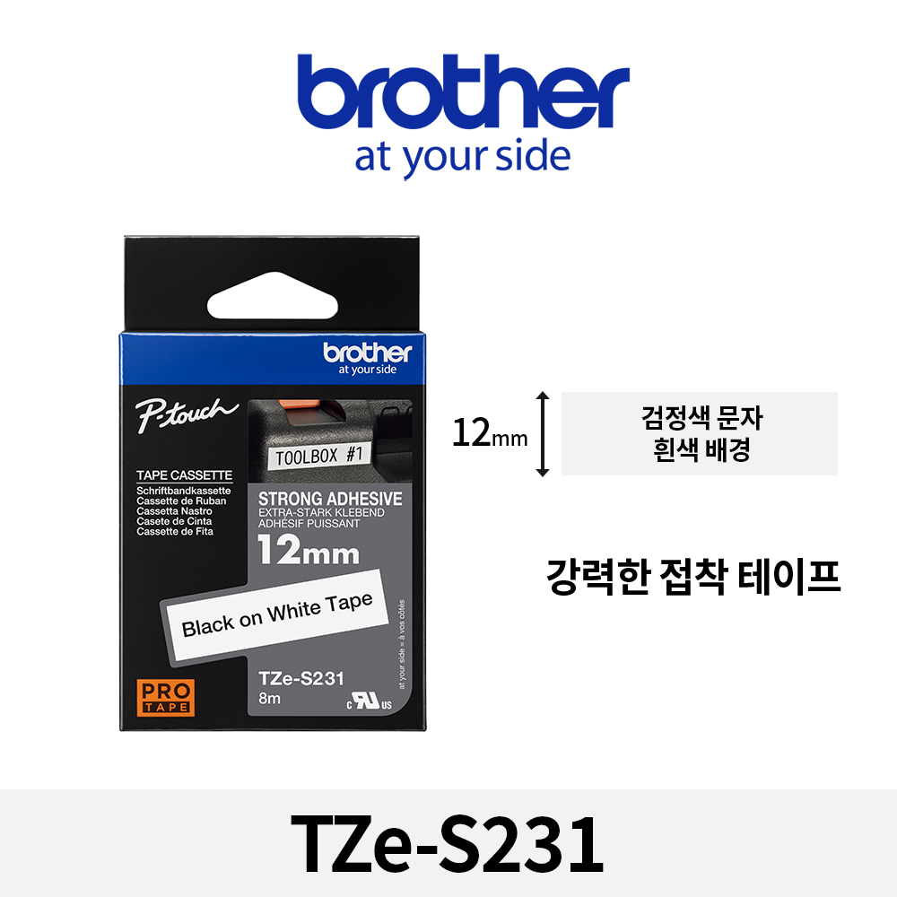 [브라더라벨기테이프] TZe-S231 (흰색바탕/검정글씨) 12mm 접착력이 강력한 라벨테이프 정품카트리지